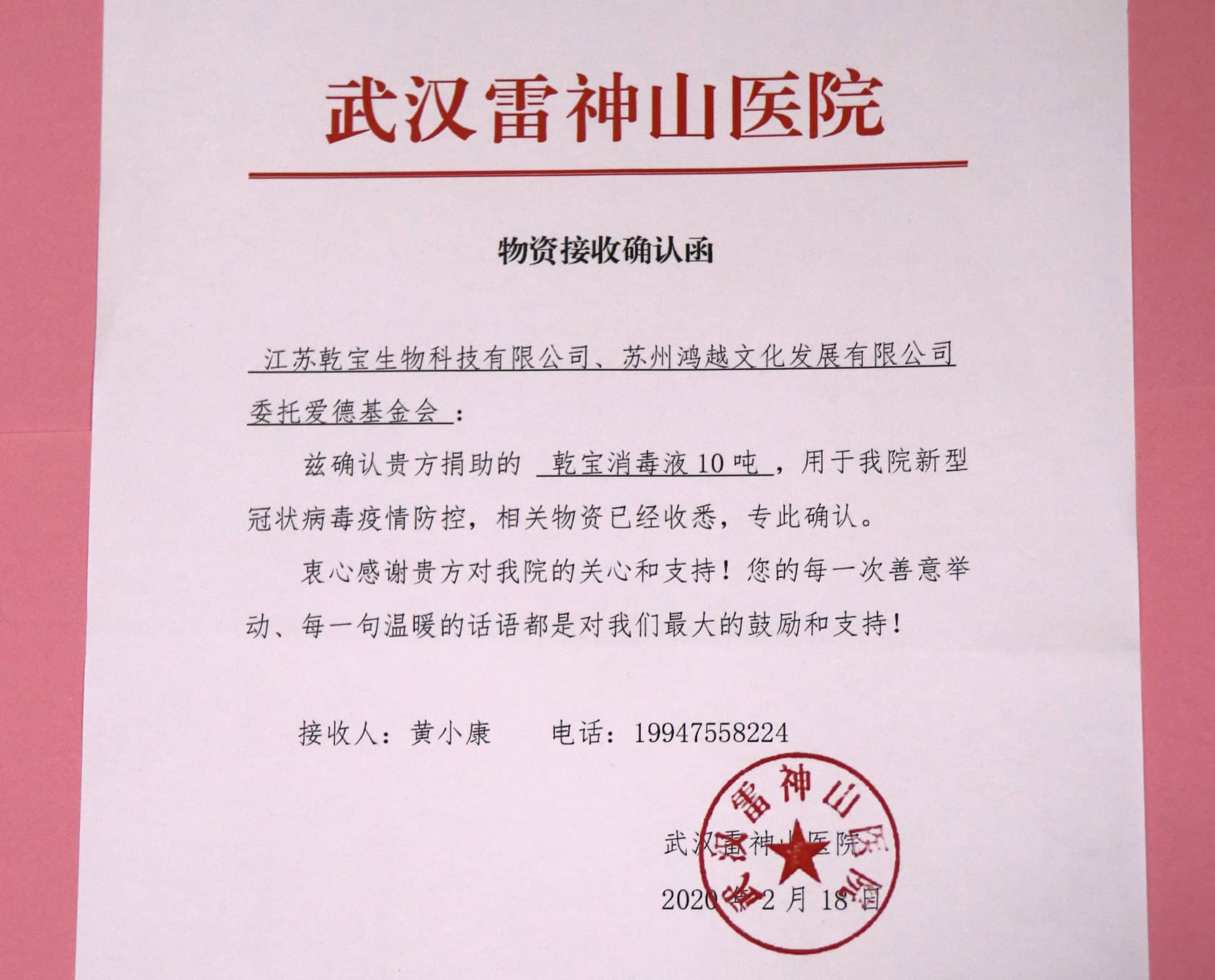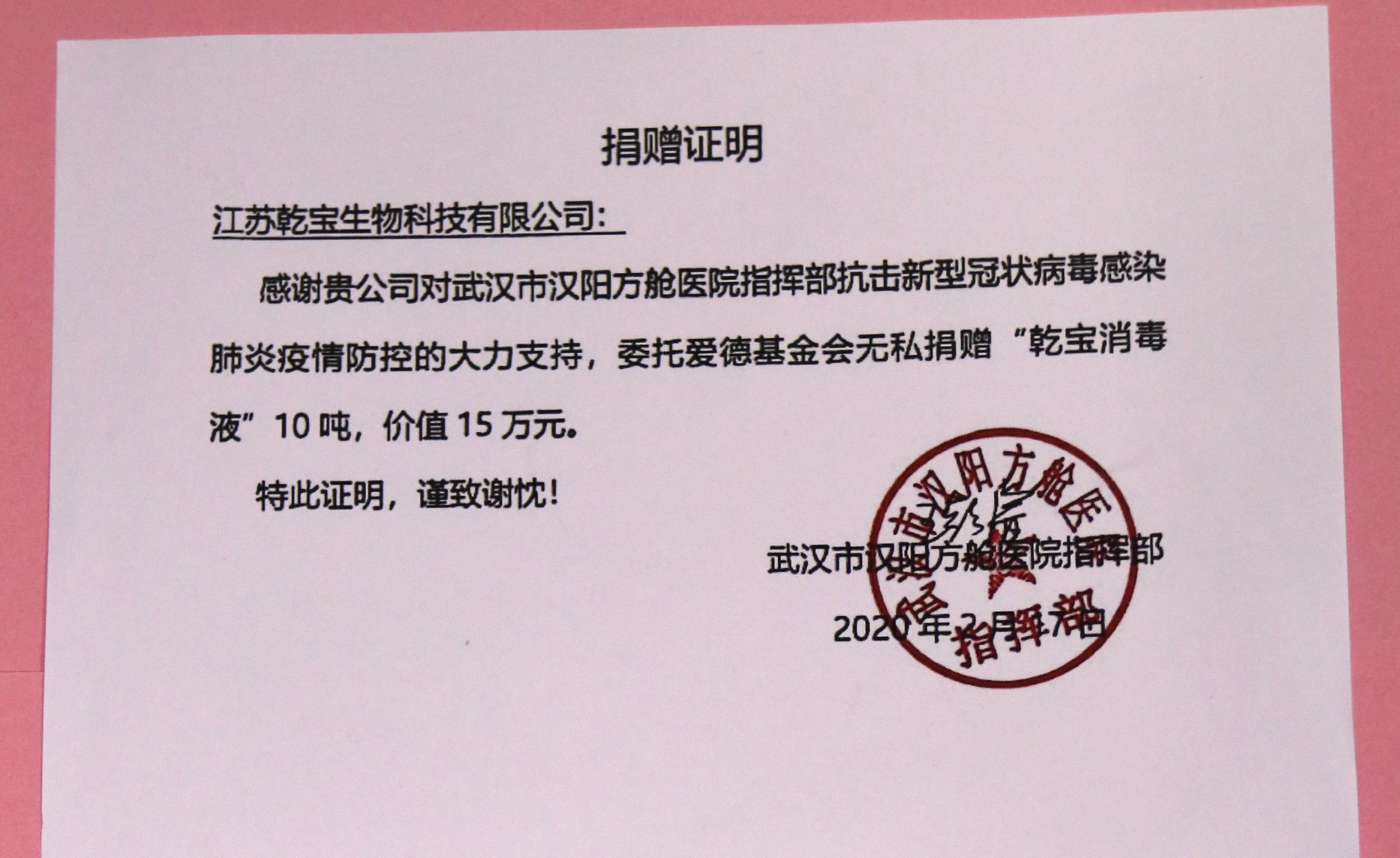 2020年2 16日,江蘇乾寶集團組織旗下的乾寶生物科技有限公司聯手蘇州鴻越文化發展有限公司,委托愛德基金會再次向武漢捐贈消毒液30噸,其中向雷神山和方艙兩家醫院捐贈消毒液各10噸,向湖北省軍區保障局捐贈消毒液 10