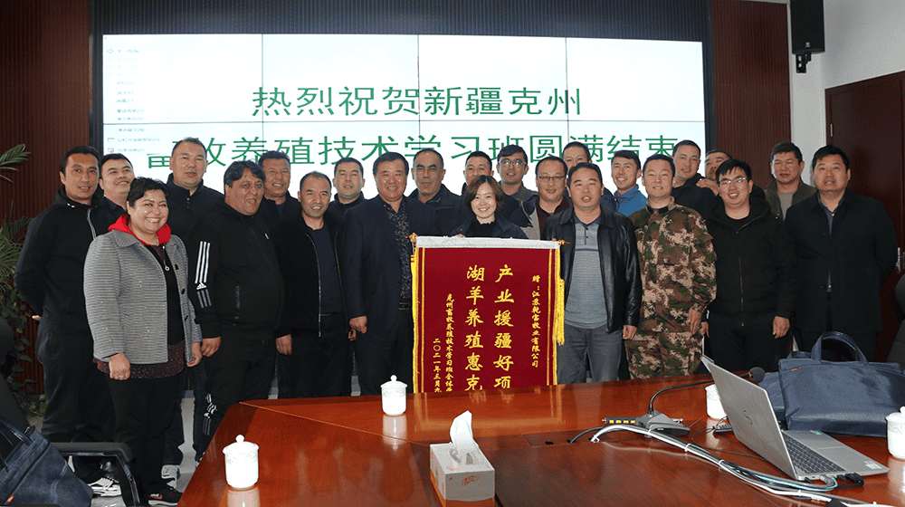 3月19日上午,江蘇乾寶牧業(yè)公司會議室里,洋溢著歡樂友好的氣氛,乾寶牧業(yè)公司總裁蔣柏林熱情地與來自新疆克孜勒蘇柯爾克孜自治州19位學(xué)員親切座談,回答了學(xué)員們提出的湖羊養(yǎng)殖政策、管理和技術(shù)方面的問題,學(xué)員們感到受益匪淺。座談結(jié)束后,學(xué)員代表將一面印有“產(chǎn)業(yè)援疆好項目,湖羊養(yǎng)殖惠克州”金字錦旗贈送給乾寶牧業(yè)公司,以表達(dá)他們的感激之情。