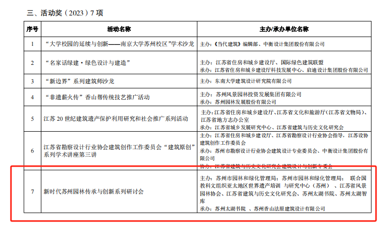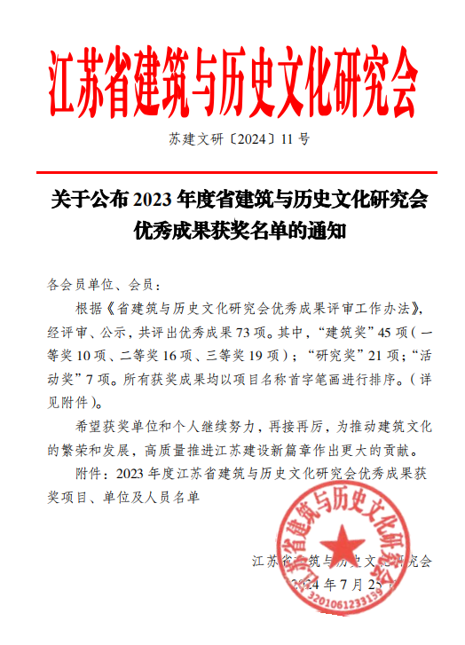 2024年7月25日,省建筑與歷史文化研究會公布了2023年度省建筑與歷史文化研究會優秀成果獲獎名單。經評審、公示,共評出優秀成果 73 項。其中,“建筑獎”45 項(一等獎 10 項、二等獎 16 項、三等獎 19 項);“研究獎”21 項;“活動獎”7 項。其中,蘇州太湖書院、蘇州太湖智庫榜上有名。