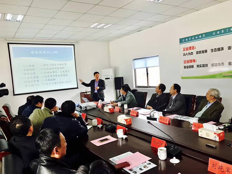 鹽城市市長戴源,秘書長徐龍波,人社局長王娟及科技、農業等部門負責人與行業領導、院士、專家學者就產學研合作進行了深入的交流,對乾寶牧業走科技、生態、循環發展定位表示堅決支持。