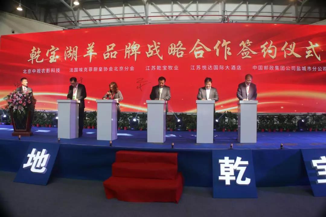 為深入挖掘乾寶湖羊文化、進一步研發和打造乾寶湖羊羊肉產品、不斷提升乾寶湖羊品牌在國內外消費市場中的影響力,由江蘇乾寶牧業有限公司與北京中視農影科技有限公司、法國埃克菲廚皇協會北京分會、悅達國際大酒店、中國郵政集團公司鹽城分公司共同簽署戰略協議。