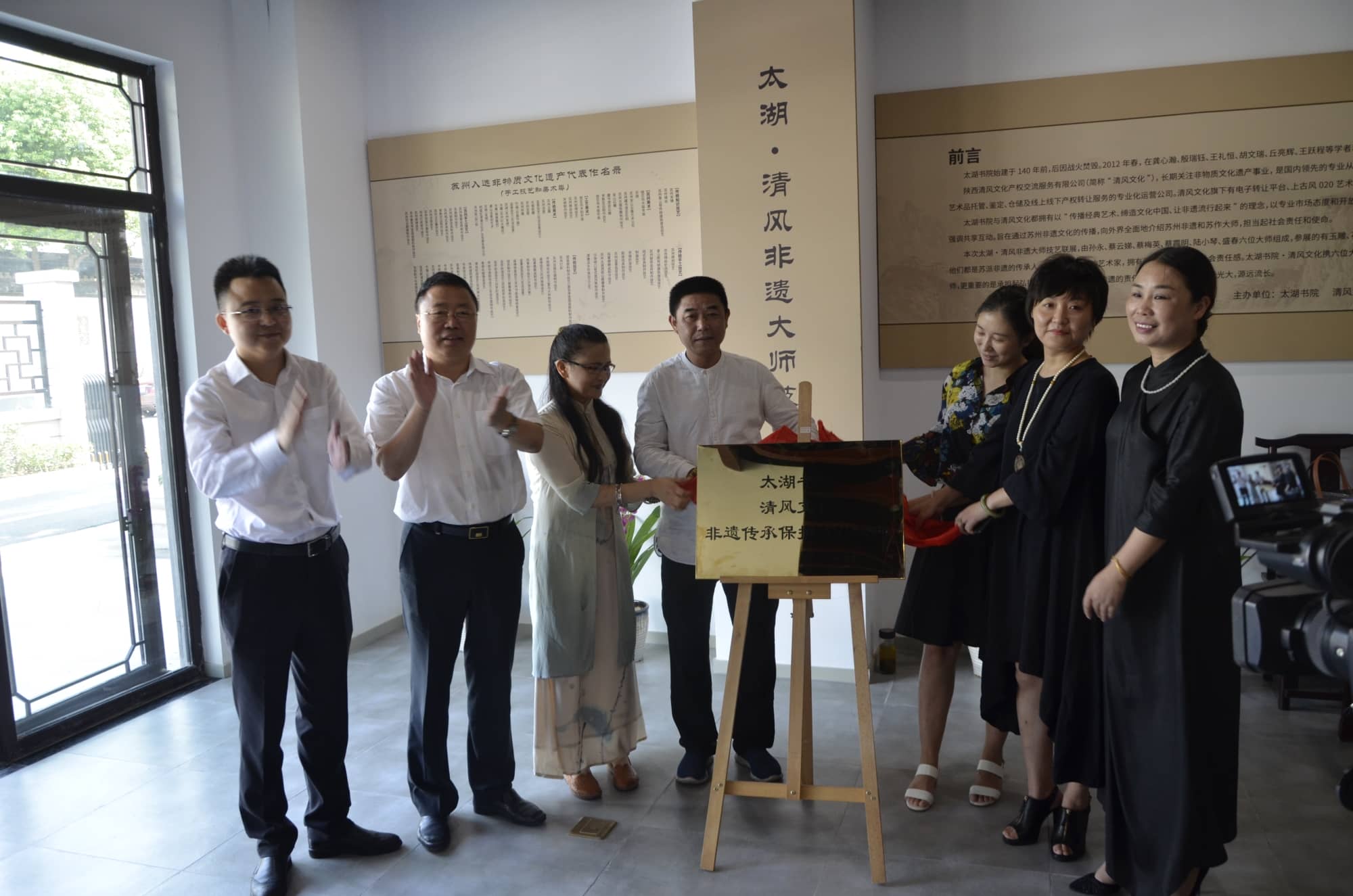 ?????? 2017年9月18日上午10點,太湖書院攜手清風文化舉辦了非遺精品展覽,拉開了太湖·清風與眾多非遺大師合作的序幕。江蘇乾寶投資集團副董事長朱波主持了揭幕儀式。參加此次非遺精品展的大師有蔡云娣,蔡梅英,蔡霞明,陸小琴,盛春,孫永等。嘉賓有江蘇乾寶投資集團董事長王躍程,陜西清風文化產權交流服務有限公司總經理李寶庫,太湖書院執行院長沈陽,江蘇乾寶投資集團執行總裁王翼寧、常務總裁王榮華,今日頭條、蘇州區房產運營總經理張會來,江蘇乾寶投資集團副總裁徐正強,太湖書院副院長丘東,陜西清風文化產權交流服務有限公司、清風非遺博物館館長任元鴻,蘇州大學教授費湘軍,陜西清風文化產權交流服務有限公司產品總監陸洋,陜西清風文化產權交流服務有限公司市場總監黃蕊卿,西安大唐古玩市場總經理唐亮等出席了展覽活動。太湖書院執行院長沈陽、清風文化非遺博物館館長任元鴻、非遺傳承人代表蔡梅英老師先后發表熱情洋溢的致辭,都希望通過此次活動弘揚主族律,傳播正維量,齊心協力把中國傳統文化發揚光大。儀式上,大師們為太湖書院·清風文化非遺傳承保護合作基地揭牌,共同見證了乾寶文化與清風文化戰略合作的簽約儀式,活動取得了圓滿成功。