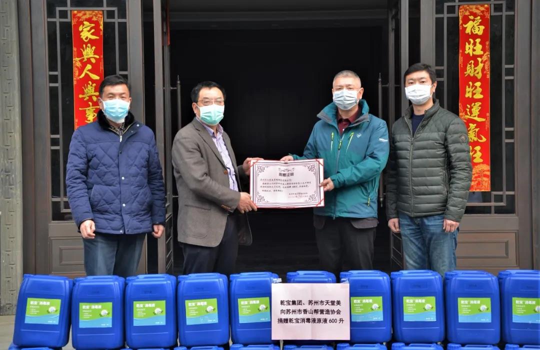 隨著企業陸續復工,疫情防控工作進入防疫和復工“兩手抓”階段。2020年2月25日,乾寶集團再次伸出援助之手,旗下企業蘇州市天堂美景觀綠化工程有限公司向蘇州市香山幫營造協會捐贈消毒液原液600升,以實際行動支援蘇州市香山幫營造協會內園林古建企業的疫情防控和復工工作