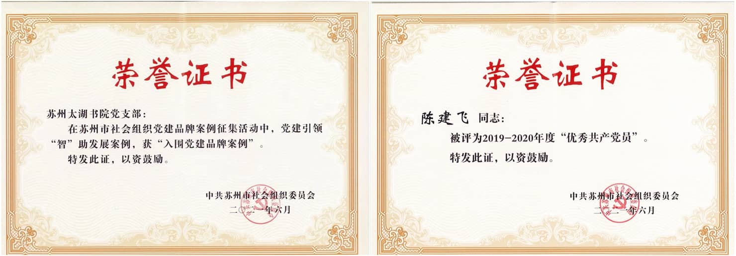 太湖書院黨支部自成立以來,始終堅持以習 近平新時代中國特色社會主義思想為指導,在蘇州市社會組織黨委的領導下,不斷加強黨的建設,凝聚黨員,引領群眾,促進內涵發展,同時立足書院自身實際,充分發揮智庫功能優勢,探索出一條“黨建+智庫”的民非社會組織基層黨建新模式。在6月份蘇州市社會組織黨委舉辦的慶祝建黨100周年暨“紅社發布”活動上,書院黨支部“黨建引領,‘智’助發展”案例成功入圍百個社會組織黨建品牌案例,中共太湖書院黨支部被評為“先進基層黨組織”,支部宣傳委員陳建飛同志被評為“優秀共產黨員”。
